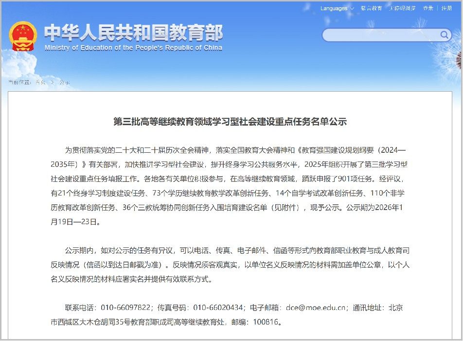 “学习型社会建设重点任务”是2023年教育部职成司为实施教育部学习型社会建设和国家教育数字化战略工程,加快推进学习型社会建设而制定的一系列重点任务。分为终身学习制度建设、学历教育、非学历教育、高等教育自学考试和三教统筹协同等五个类别。立项开展3年来,越来越受到成人教育与职业教育领域重视,申报项目数每年大幅增长,2025年在申报的901项任务中,共评审通过254项。