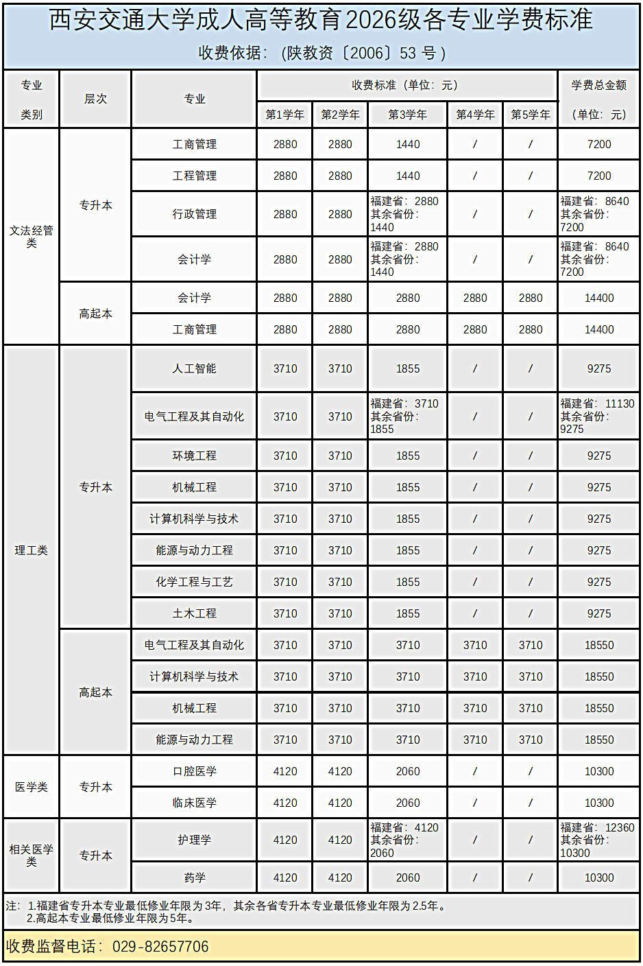 西安交通大学成人高等教育2026级各专业学费标准